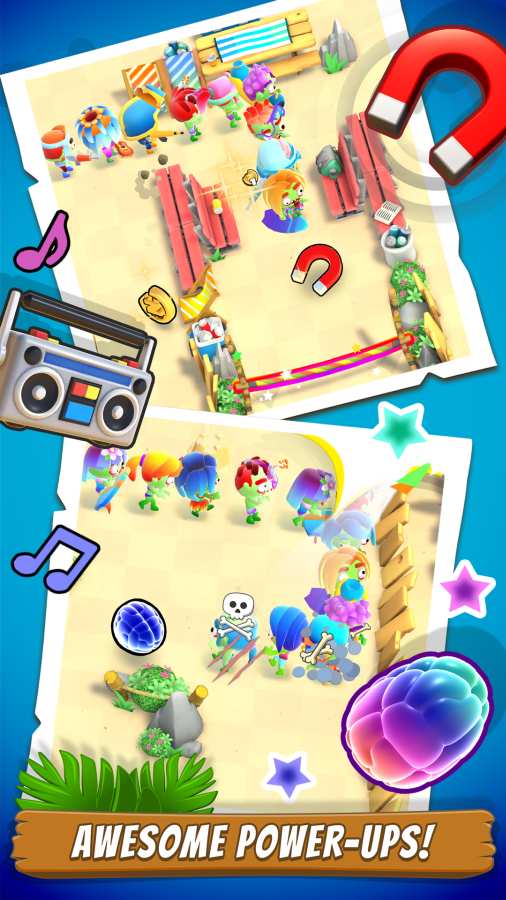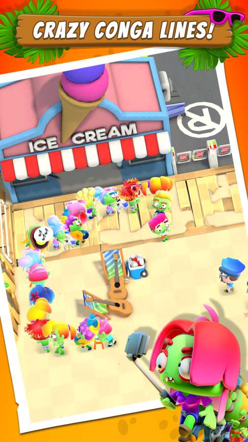 1、成为聚会的逍遥游:游戏创新性地将僵尸感染过程设计成了一场欢乐派对,玩家可以带领自己的僵尸队伍在沙滩上跳起独特的康加舞。每感染一个游客,队伍就会增加一个新成员,看着越来越长的僵尸队伍,成就感油然而生。