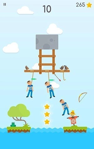 3、灵活调整射击角度射断绳子救人,随着关卡推进,目标位置会出现在左右两侧不同高度,需要玩家快速判断最佳射击路线,同时争取更高分数,为后续挑战积累优势。