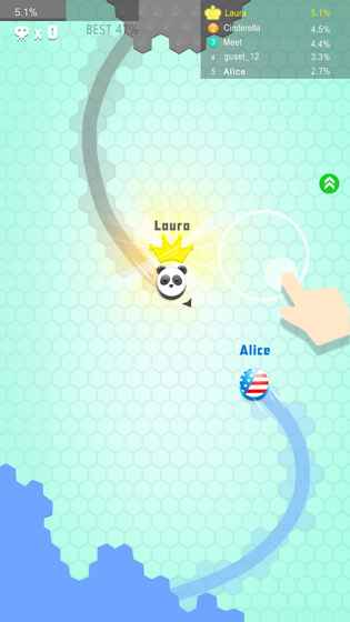 游戏采用触屏划线机制,玩家需用手指绘制完整闭环来占领地盘,闭合区域越大获得分数越高。遇到敌人时,可快速切断其行进路线进行围剿,但要注意保护自己的尾巴不被他人截断。随着等级提升,还能解锁喷气加速、临时护盾等特殊技能。建议初期采取守势,待积累足够领地后再主动出击,多人对战时要特别注意来自背后的偷袭,灵活运用Z字形走位能有效规避危险。