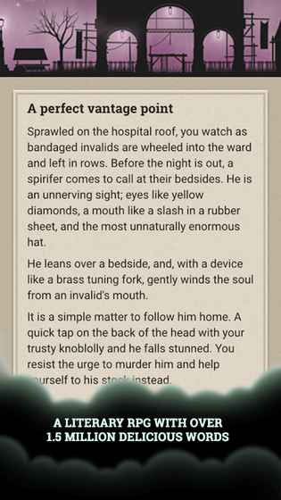 1、暗黑风格的文字冒险游戏,游戏主要以剧情为主,玩家在游戏中可以回到过去亲眼见证伦敦陷落的情景。独特的"记忆碎片"系统让玩家能够收集关键历史片段,拼凑出完整的故事真相。