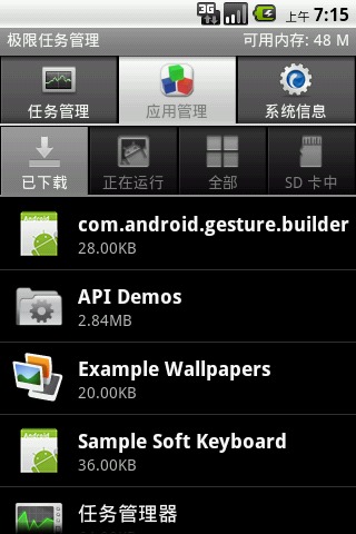 极限任务管理器是一款功能强大的系统优化工具,专为安卓设备设计。它不仅能够帮助用户高效管理手机应用,还能实时监控系统状态,让设备运行更加流畅。通过直观的界面,用户可以轻松查看和管理所有已安装的应用程序,包括卸载、清理缓存以及将应用移至SD卡以释放宝贵的内存空间。此外,它还提供了详细的系统信息,如电池状态、信号强度和系统版本等,让用户随时掌握设备运行状况。无论是日常使用还是深度优化,极限任务管理器都能满足您的需求。