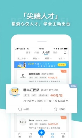 发布项目,悬赏任务:需求方可通过标准化模板快速发布项目,支持固定价格、竞标、按工时等多种合作模式,3分钟即可完成项目上线,接单方式灵活多样。