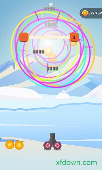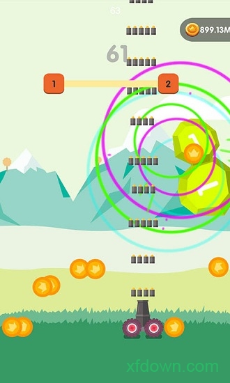 2、弹球根据物理轨迹自由掉落和弹起,每个弹球上都有各自对应的数字,表示击毁它需要的子弹数。玩家需要合理分配火力,优先击破关键目标。