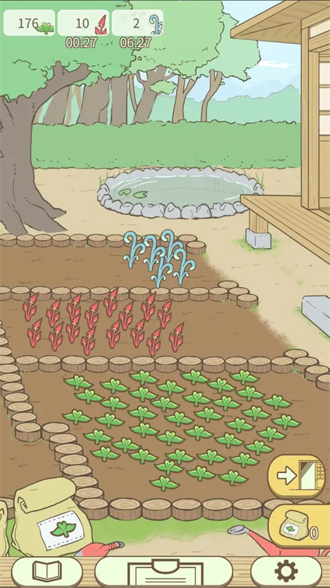 完成室内操作后,可以点击右下角的出门图标前往室外药圃。这里是种植各类药草的主要场所,药草会按照固定周期生长,需要玩家手动采集。游戏贴心地设置了小猫助手功能,使用特定道具可以让小猫帮忙打理药圃,大大减轻玩家的操作负担。