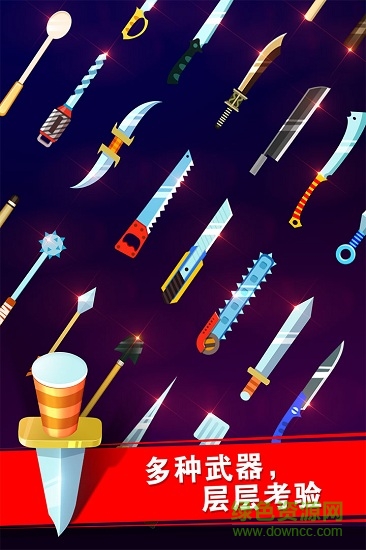 3.多种武器,层层考验 - 收集超过50种造型各异的飞刀,每把飞刀都有独特的飞行特性,需要玩家不断适应和掌握。