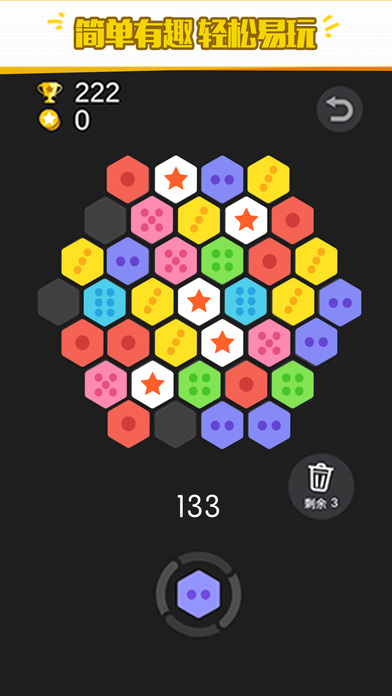 游戏操作直观易懂:点击屏幕下方的方块可进行旋转调整,拖拽至上方六边形网格中完成放置。当三个或更多同色(或同数字)的方块相连时,即可触发消除效果。游戏融合了俄罗斯方块的放置策略与三消游戏的连锁反应机制,创造出独特的游戏体验。随着游戏进行,玩家需要预判多个步骤后的局面变化,合理规划每一步操作。游戏还设置了多种特殊方块和道具,如炸弹方块、变色方块等,为游戏增添了更多策略维度。每次消除都会带来爽快的视觉反馈和音效,让玩家获得强烈的成就感。