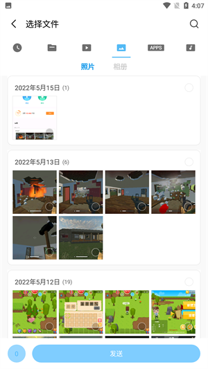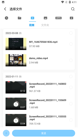 2、选择要发送的文件;支持多选操作,可以一次性发送整个文件夹。文件选择界面会智能分类显示各类文档,并提供强大的搜索功能。选择完成后会显示文件总大小和预估传输时间。