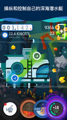 2、有多个潜水艇可进行升级强化提升属性。游戏中共有12种不同型号的潜水艇可供解锁,每种潜艇都有独特的性能特点。通过收集资源,你可以逐步提升潜艇的耐久度、下潜深度和采集效率,打造属于自己的完美探险装备。