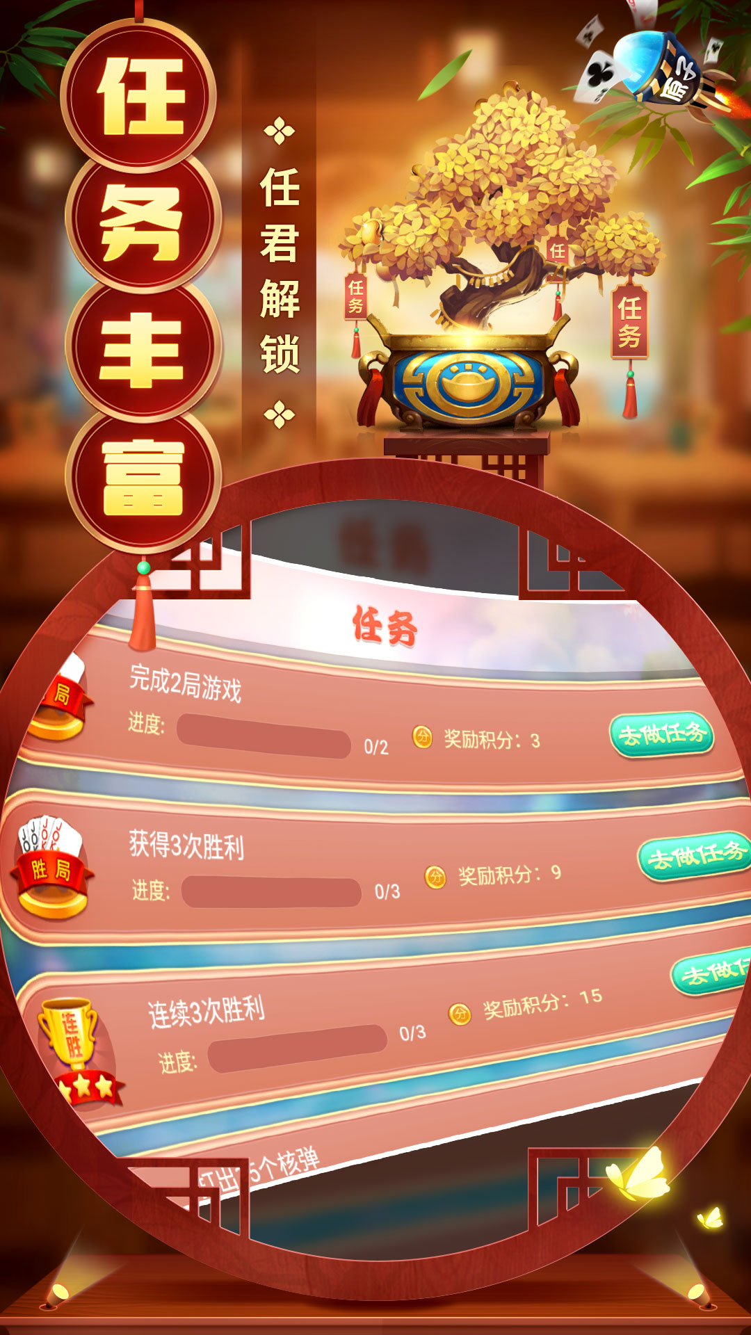 3、[一键快速配桌,畅玩不停]智能匹配系统能在3秒内为你找到合适对手,省去漫长等待时间。[任务丰富多样,等你解锁]每日签到、连胜任务、特殊牌型任务等多种挑战等你来完成,完成任务可获得丰厚奖励,让游戏体验更加丰富多彩。