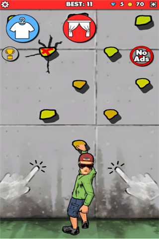 《攀岩墙2》是一款充满趣味性的休闲攀岩游戏,玩家将操控角色在垂直的岩壁上不断向上攀登,灵活躲避随机出现的障碍物和陷阱。游戏采用简约清新的美术风格,提供多种可解锁角色和特色岩壁,搭配多样化的游戏模式,带来轻松愉快的游戏体验。玩家需要通过快速点击屏幕左右两侧来控制角色攀爬方向,同时收集时钟道具延长游戏时间,避开破碎岩石等危险地形。游戏节奏明快,既考验反应能力又能帮助玩家释放压力,适合在碎片时间享受攀岩乐趣。