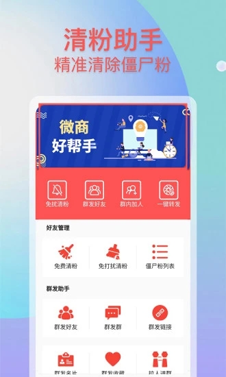 助手Proapp是一款专为微商用户打造的高效管理工具,能够帮助用户轻松获取优质客户资源,大幅提升工作效率。该软件集成了多种实用功能,包括好友管理、群发消息、朋友圈转发等,让微商营销变得更加简单高效。无论是个人微商还是团队运营,都能通过这款软件实现精准营销和客户维护,节省大量时间和精力。快来下载体验,开启您的智能微商之旅!