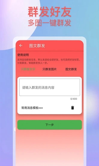 2.支持文字、图片、视频等多种形式的群发功能,满足不同营销场景的需求,让您的推广内容更加丰富多彩;无论是节日祝福还是产品宣传,都能轻松应对。