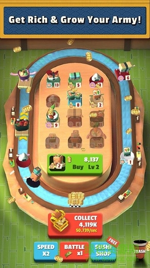 5、创新的寿司赛跑玩法让经营不再单调,玩家可以训练寿司们的速度属性,举办精彩的寿司竞速比赛,吸引顾客下注,获得额外收入;