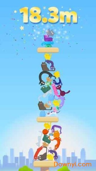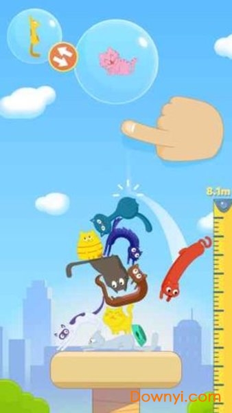 1、游戏考验玩家的空间感和平衡感,需要旋转调整猫咪的姿势,找准最佳位置放下,才能堆出又高又稳的猫咪塔,挑战最高分数记录!