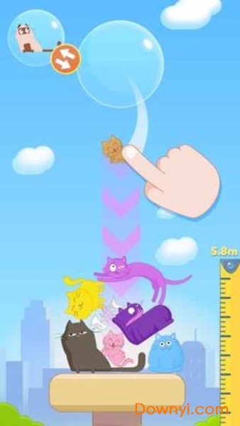 4、游戏操作简单直观,上方传送带会不断输送新的猫咪,玩家只需轻触屏幕选择合适的位置,就能让猫咪精准落下,轻松上手但难以精通。