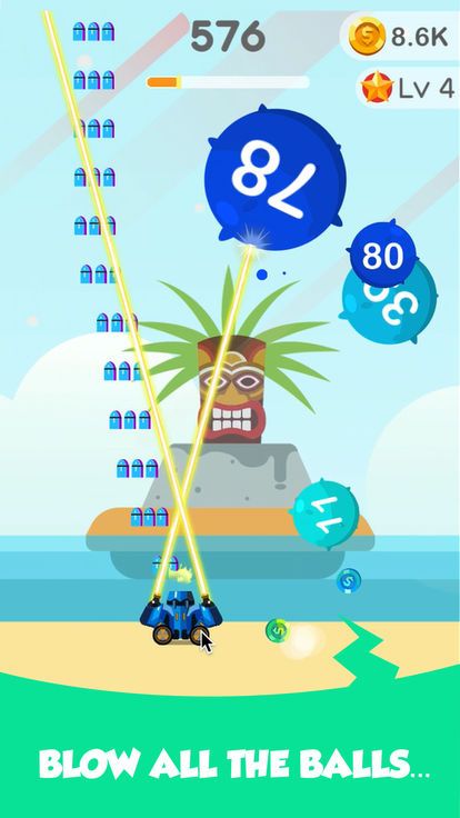 2、选择你的武器炸毁敌人的球,游戏中拥有超多武器以及道具哦。从基础的弹弓到高级的激光炮,每种武器都有独特的攻击效果和操作手感。道具系统同样丰富,包括减速道具、范围爆炸等,合理使用这些道具能帮助你更轻松地通过高难度关卡。