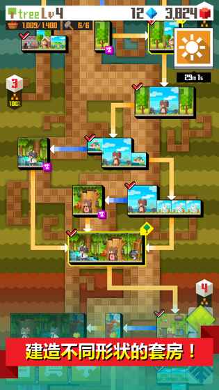 3、发展小动物居民是游戏的一大亮点。通过点击大树可以获得宝石奖励,但要实现持续发展就需要雇佣小动物工作。玩家需要精心规划,让不同种类的小动物协同合作,共同建设繁荣的树村社区。