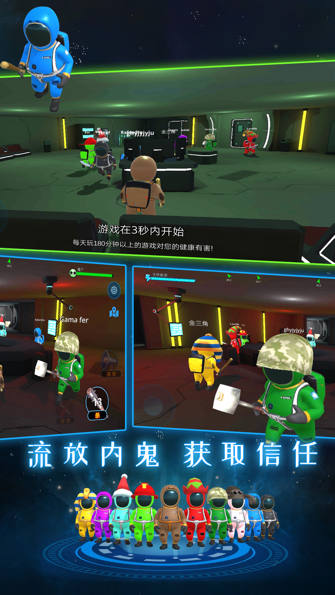 -无辜者(作为宇航员,乘务员,好人)可以通过放开炸弹,消灭所有僵尸或发现并投票给我们冒名顶替者而获胜。无辜者阵营的玩家需要通过完成维修任务、收集证据和召开紧急会议来识别并淘汰冒名顶替者。