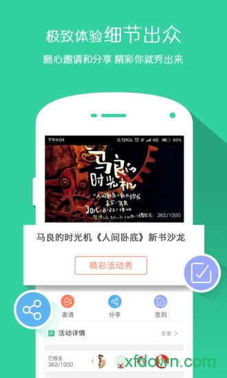 1.【发布活动、一键分享】零门槛创建各类活动,无论是部门聚餐、行业沙龙还是马拉松赛事,都能快速生成专属活动页面。独创的智能分发系统可将活动同步推送至微信朋友圈、QQ空间等12个主流社交平台,通过算法优化触达潜在参与者。活动页面支持自定义背景、报名表单等个性化设置,让每次召集都独具特色。