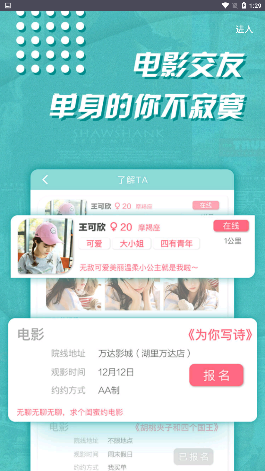 约约电影不仅是一个简单的观影约伴平台,更是一个连接同城兴趣相投者的社交空间。在这里,你可以发现身边同样热爱电影、游戏、健身的小伙伴,建立真实有趣的社交关系。平台采用严格的身份认证机制,确保用户安全;智能算法会根据你的观影偏好、空闲时间和地理位置,为你推荐最匹配的约伴对象。无论是想讨论最新上映的科幻大片,还是寻找一起二刷经典老片的知音,约约电影都能满足你的需求。我们还定期组织线下观影会、主题派对等活动,让你的社交圈不断扩大。