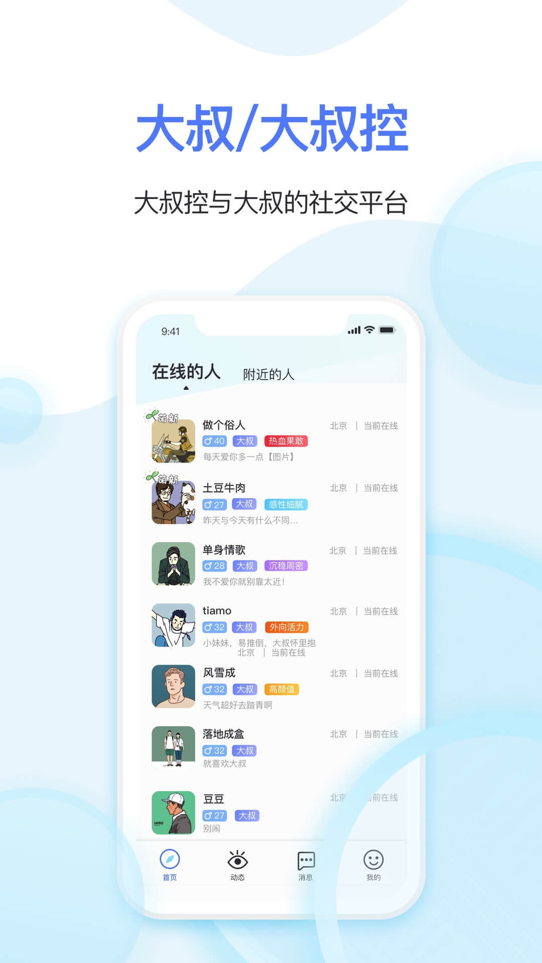 Hello大叔是国内首个专注于成熟男性社交的垂直平台,致力于为25岁以上的单身大叔和大叔控搭建一个安全、高效的交流空间。平台严格审核用户资料,确保交友环境的真实可靠。在这里,你可以通过详细的个人资料和兴趣标签,快速找到与自己三观相符的伙伴。无论是寻找知心好友,还是期待浪漫邂逅,Hello大叔都能满足你的社交需求。独特的社区文化让每位用户都能找到归属感,开启不一样的社交体验。