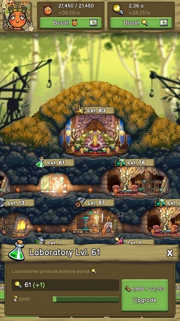3、游戏采用了创新的放置玩法机制,即使离线期间,你的蚁群也会自动进行生产和研究。这种设计让玩家可以更轻松地享受游戏乐趣,不必时刻守在屏幕前。