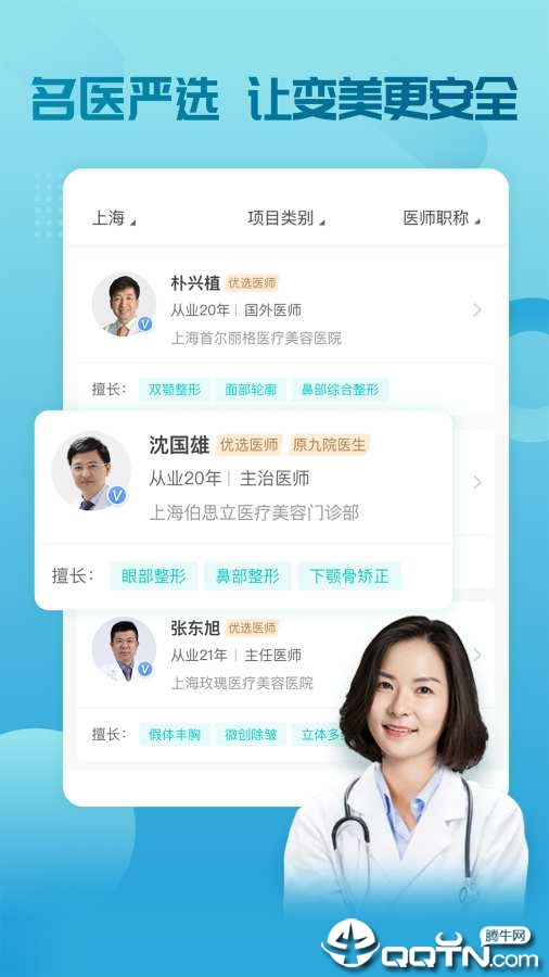 【名医严选】平台严格审核医生资质,只与经验丰富、口碑良好的医师合作。通过学历、执业证书、案例等多维度考核,确保您接触到的都是真正的医美专家。