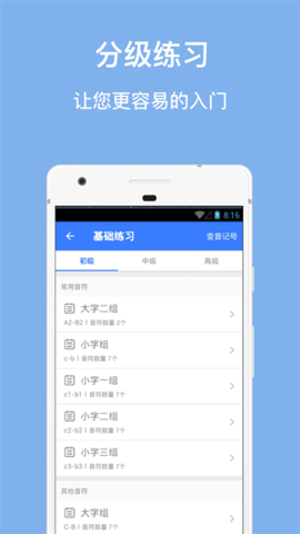 2、针对性的基础练习:考虑很多刚接触五线谱的用户遇到这么多钢琴键而不知所措的情况,我们针对性的将基础练习分为初级、中级、高级。在初级中我们将每个组别单独拎出来做练习,这样能让用户更好的练习和巩固。每个级别都设置了循序渐进的学习目标,确保用户能够稳步提升识谱能力。