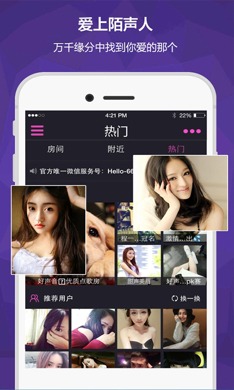 1、独特的声纹分析系统能精准识别你的声音特质,帮你找到最匹配的声音伴侣,开启全新的交友体验。2、丰富的主题游戏房间让你能与兴趣相投的朋友一起玩耍,享受沉浸式的娱乐时光。3、智能连麦系统通过算法为你精准匹配潜在好友,大大提高交友成功率。4、多样化的社交场景包括速配交友、秘密树洞、音乐房等,满足不同用户的社交需求。5、丰富的互动功能如开黑、群聊、K歌等,让你轻松找到玩伴,享受热闹的社交氛围。