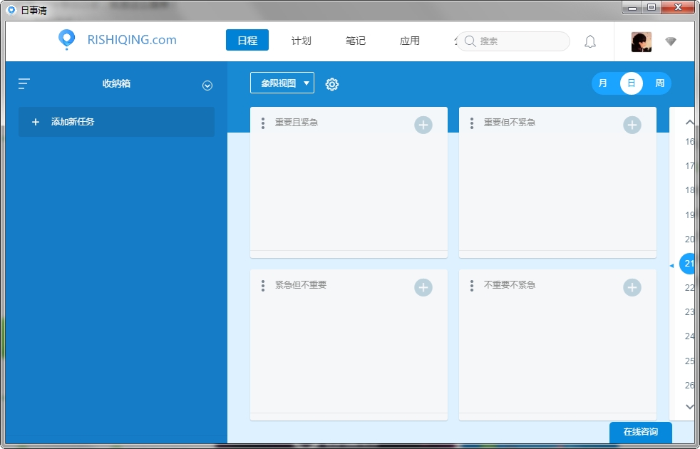日程:智能收纳箱自动归类待办事项,四象限法则帮助区分任务优先级,日历视图直观展示日程安排,支持周期性重复任务设置,任务可下发并附带讨论记录。