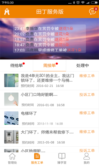 2.我要报修:建立标准化报修流程,用户可上传文字描述、照片或视频说明故障情况。物业端智能派单系统自动匹配最近维修人员,实时跟踪处理进度,维修完成后还可进行服务评价,形成闭环管理。