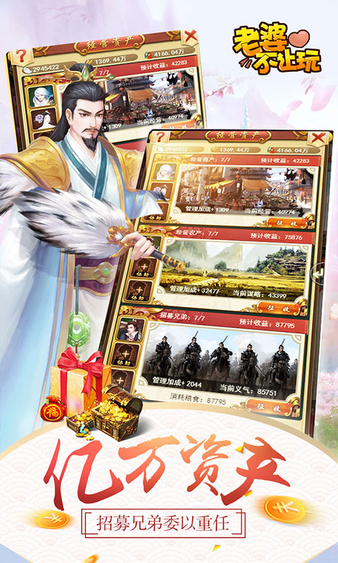 《老婆不让玩》是一款极具沉浸感的古风经营养成RPG手游,带你穿越时空体验别样人生。游戏以精美细腻的画面呈现出一个波澜壮阔的古代世界,在这里你不仅能运筹帷幄、建功立业,还能邂逅各色佳人,谱写浪漫传奇。从白手起家到富甲一方,从孤身一人到妻妾成群,每个选择都将影响你的命运轨迹。丰富多样的玩法系统让你既能享受策略经营的乐趣,又能体验热血沸腾的江湖争斗,更有意想不到的奇遇等你发现。