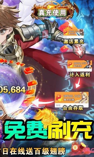 版本特色:全新刷充科技,极速打金无上限!全方位打金,挂机,闯关,刷充BOSS均掉落直充币,瞬间帮你通过填满直充钱包。