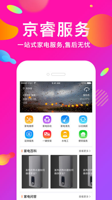 1.京睿服务,提供给您品质可控,价格透明,响应速度快的一站式家电(维修、安装、回收、清洗)上门服务。服务人员都经过专业培训。