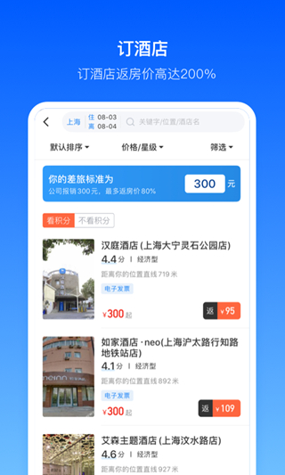 涵盖品牌连锁酒店,极简流程,闪电效率,快速预订。与全国5000+家酒店达成直连合作,享受企业专属折扣价。预订时自动关联企业信息,退房时电子发票直接推送至账户,全程无需人工操作,真正实现"零接触"差旅体验。