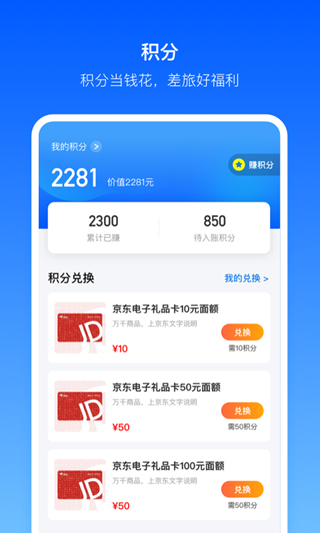 每一次差旅预订都可以赚积分,1积分等值于1元,可兑换京东卡及平台消费抵扣!积分可累计不清零,除了常规消费返积分外,完成发票归集、参与调研等任务也能获得额外奖励。企业HR还可设置积分奖励政策,将积分作为员工福利的一部分。