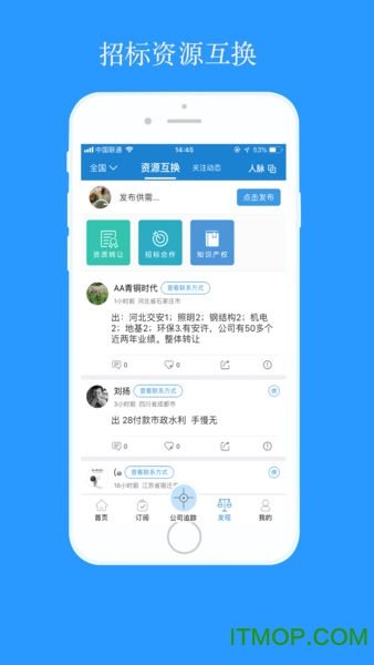 供需发布:支持投标合作、资质转让、资源对接和项目分包等信息的发布与匹配,打造高效的企业合作平台。