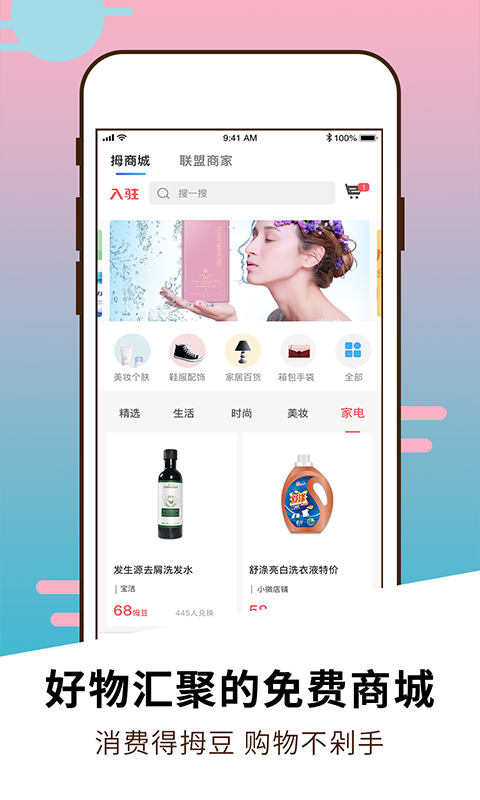 2、汇集全球好物的免费商城,好商品直接带回家。拇商城精选全球优质商品,涵盖日常生活所需,用户可通过参与平台活动获得免费购物机会。