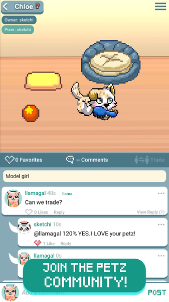 1、简单有趣的游戏玩法:从投喂零食到训练技能,所有操作都通过直观的触控完成,3分钟就能掌握全部技巧;2、清新简约的像素风格:怀旧的16bit画面搭配现代光影渲染,每只宠物都有20种以上动态表情;3、轻松欢快的音乐特效:根据场景变换的BGM系统,梳毛时的舒缓钢琴曲与玩耍时的欢快口哨曲无缝切换;4、打发时间的绝佳选择:离线挂机也能获得收益,宠物会自主活动并积累成长值,随时上线都有惊喜。