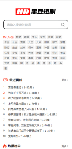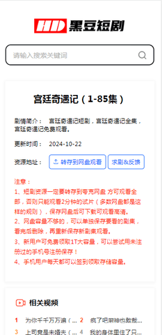 黑豆短剧是一款专注于短剧内容聚合与播放的优质平台,为用户提供海量丰富的短剧资源。在这里,你可以轻松发现各类题材新颖、创意十足的短剧作品,无论是都市情感、古装传奇还是悬疑推理,都能满足你的观影需求。平台采用智能推荐算法,根据你的观看偏好推送个性化内容,让你快速找到心仪的短剧。流畅的播放体验和便捷的搜索功能,让你随时随地享受追剧乐趣。高清画质、稳定播放和简洁界面设计,让每一次观影都成为愉悦体验。