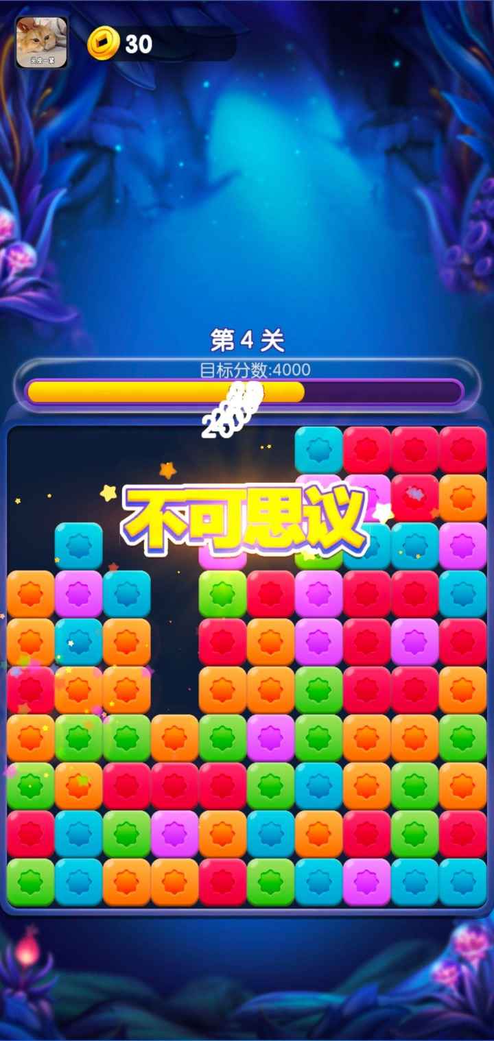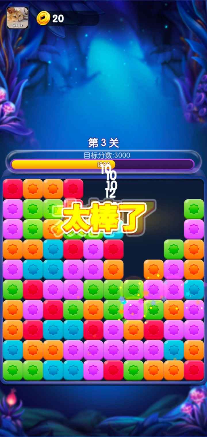 1、基础玩法要求玩家至少消除2个同色方块才能得分,简单规则带来无限可能。2、连锁消除机制让游戏更具策略性,一次性消除的方块越多,获得的分数加成越高。3、虽然游戏没有时间压力,但必须达到指定分数才能过关,这种设定既休闲又不失挑战性。