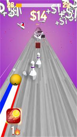 玩家需要精准控制一个保龄球在无限延伸的跑道上滚动,通过滑动屏幕来调整球的移动方向。游戏目标是尽可能多地击倒保龄球瓶来累积高分,同时还要注意避开各种突然出现的障碍物。操作看似简单但极具挑战性,需要玩家在高速移动中保持精准的判断力,找到最佳击球时机和角度。