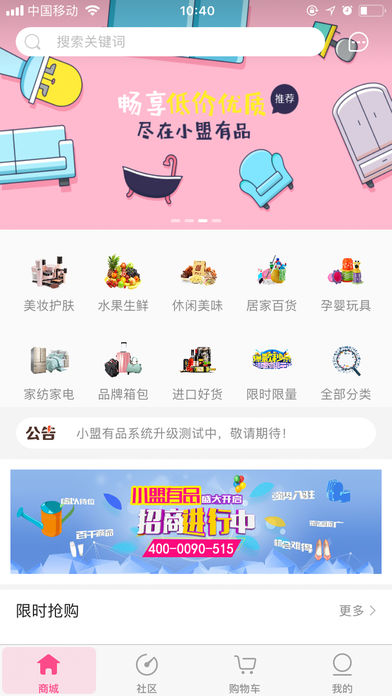 1、产品种类丰富:小盟有品提供超过10万种精选商品,涵盖日常生活各个领域,从时尚服饰到智能家电应有尽有,满足不同用户的多样化需求。平台定期更新商品库,确保用户总能找到最新最潮的商品。