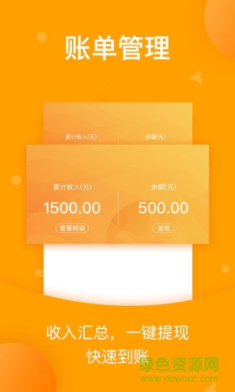 5.账单管理,收入汇总,一键提现,快速到账。财务系统透明清晰,支持多种提现方式,资金安全有保障。