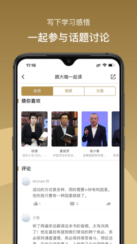 分享社交功能打破了传统阅读的局限,通过线上沙龙、电视节目等多种形式,搭建起高端人士的智慧交流平台。用户不仅可以向商界领袖学习,还能结识志同道合的商业伙伴。资源共享平台整合了来自全球的优质学习资源,包括独家商业案例、行业研究报告等珍贵资料。定期举办的线上线下活动为用户提供了面对面交流的机会,这些活动往往邀请到行业领军人物作为分享嘉宾。平台还开发了智能匹配系统,可以根据用户的阅读偏好自动推荐合适的书友和学习小组。