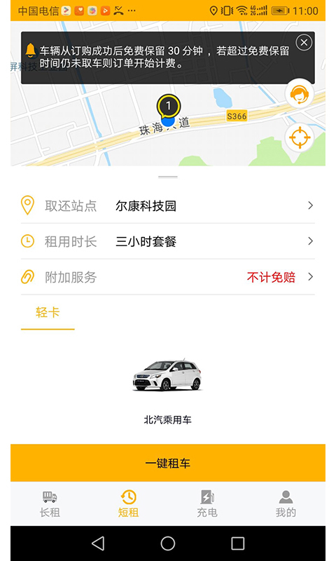 "短时自驾":创新的分时租赁模式,满足用户临时用车需求。通过手机APP即可完成预约、下单、开关车门、支付等全流程操作,无需人工交接钥匙。车辆配备智能定位系统,支持自助取还车,24小时全天候服务,让短途出行更加灵活自由。