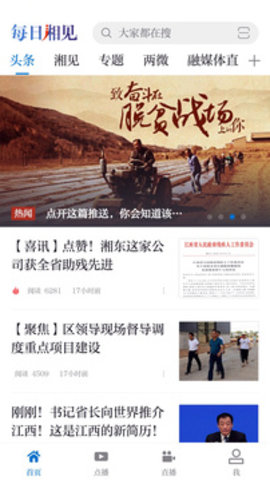 版块显示丰富的首页栏目,有标题栏目、向看栏目、专题栏目和微栏目两个。每日湘见的首页设计简洁明了,各类栏目一目了然,方便用户快速浏览最新资讯。