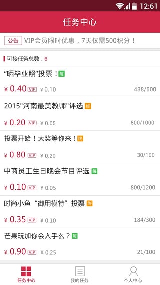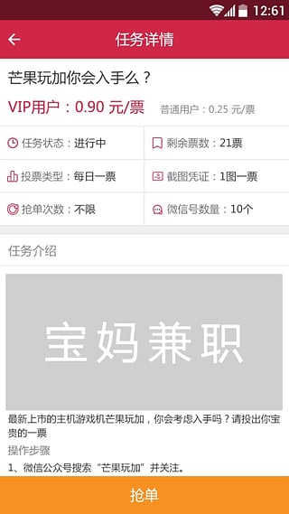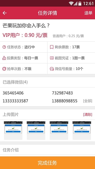 1.按地区分发任务,精准匹配您所在区域的兼职机会,让工作更便捷;2.平台汇集海量任务资源,涵盖各类兼职类型,满足不同用户需求;3.VIP会员可享受专属高薪任务,收益更丰厚;4.智能微信号动态管理系统,保障账号安全;5.滚动式公告栏实时更新最新平台动态和优惠活动;6.任务详情页面设计简洁明了,关键信息一目了然;7.图片上传功能配备直观选择器,操作简单快捷;8.邀请好友加入可获得双重奖励,推荐越多收益越高;9.支持一键分享至微信朋友圈、QQ、微博等主流社交平台。