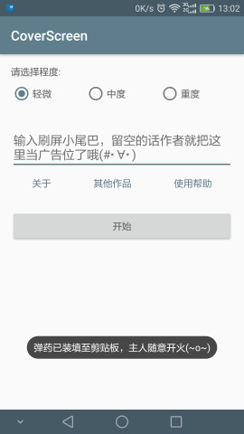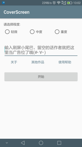 初始版本1.0正式发布,包含核心刷屏功能;创新性地加入了可自定义的刷屏小尾巴功能,让每次刷屏都与众不同;优化了三档强度选择功能,操作更加人性化;修复了部分机型上的兼容性问题,提升整体稳定性。