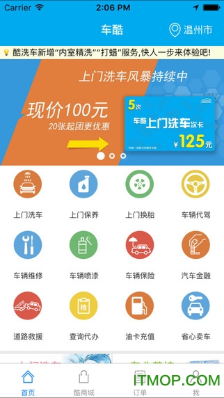 3、上门洗车:打破传统洗车模式,您的爱车停在哪里,我们的服务就到哪里,采用环保洗车设备,专业洗护,让您的座驾时刻保持最佳状态;